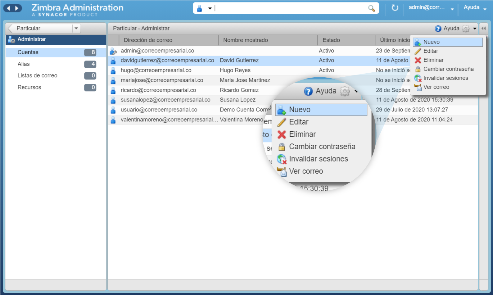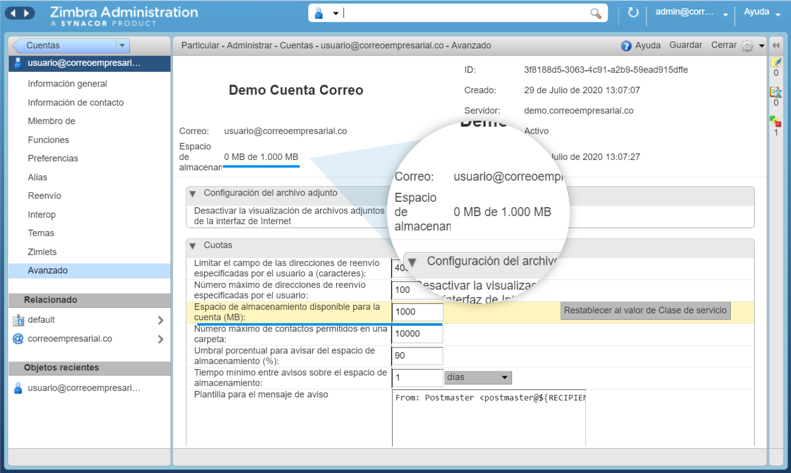 No pierda autonomía en su servidor. Siga teniendo el control y acceso 100% al panel administrador del Zimbra. Cree, modifique, elimine cuentas de correo. Gestione alias, clases de servicio, múltiples dominios y usuarios por diferente dominio. Todo lo que ya conoce del panel administrador del Zimbra.